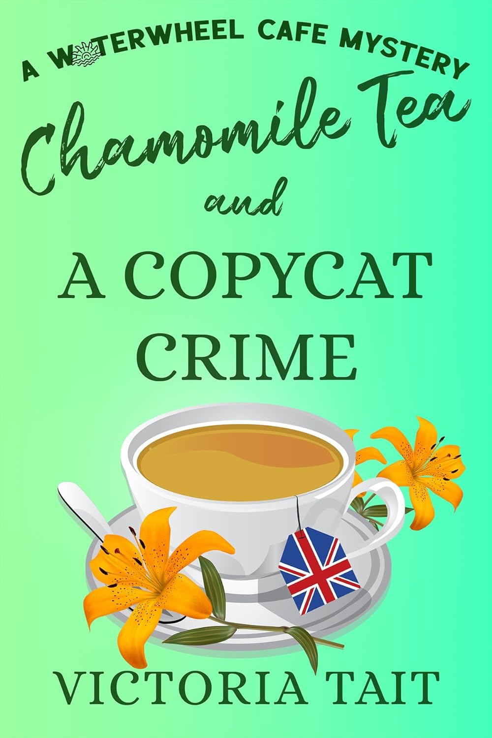 CHAMOMILE TEA AND A COPYCAT CRIME is the fourth in Victoria Tait‘s Waterwheel Cafe Mystery series. It’s a fun, cozy police procedural with an added course in business management!